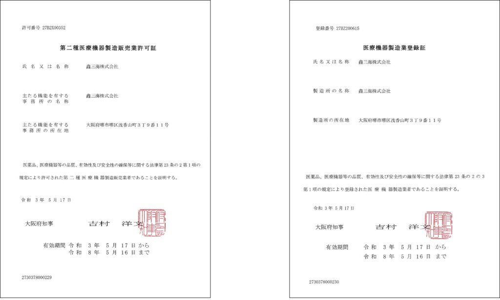鑫三海株式会社は第二種医療機器製造販売業許可証と医療機器製造業登録証を取得、管理医療機器の取り扱いをはじめます
