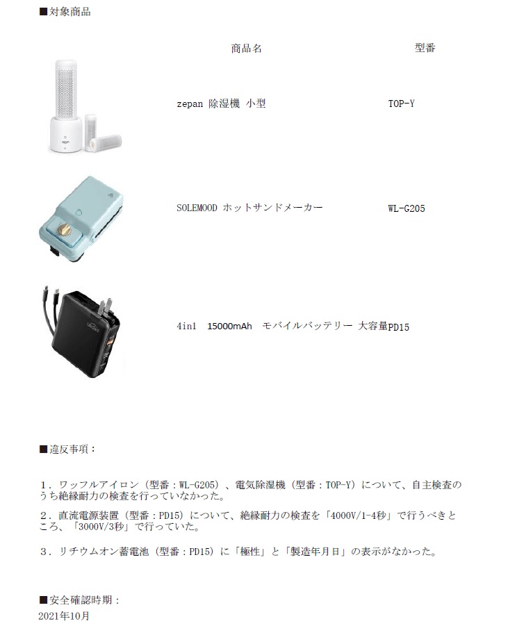 この度、弊社が販売しております下記3製品につきまして、電気用品安全法に抵触していたことが判明いたしました。