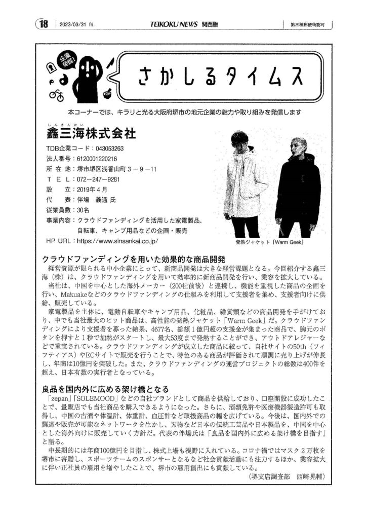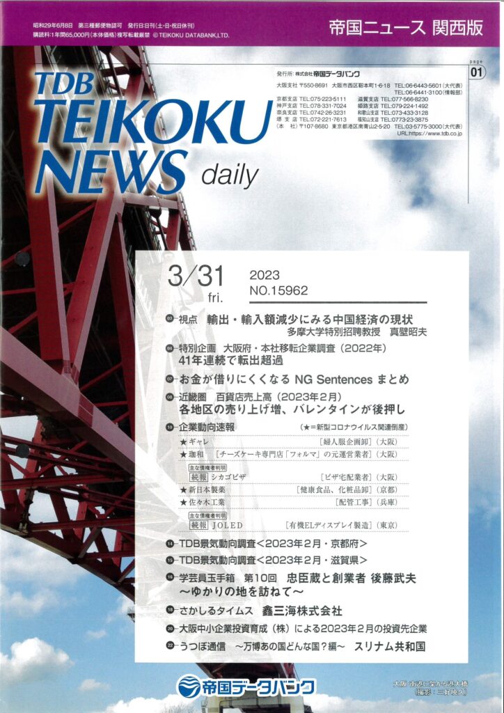 「帝国ニュース 関西版」で紹介されました鑫三海株式会社 広報部2023年4月3日プレスリリース 帝国データバンクの広報誌「帝国ニュース 関西版3/31」(2023 NO.15962)でキラリと光る堺市の地元企業として紹介されました。